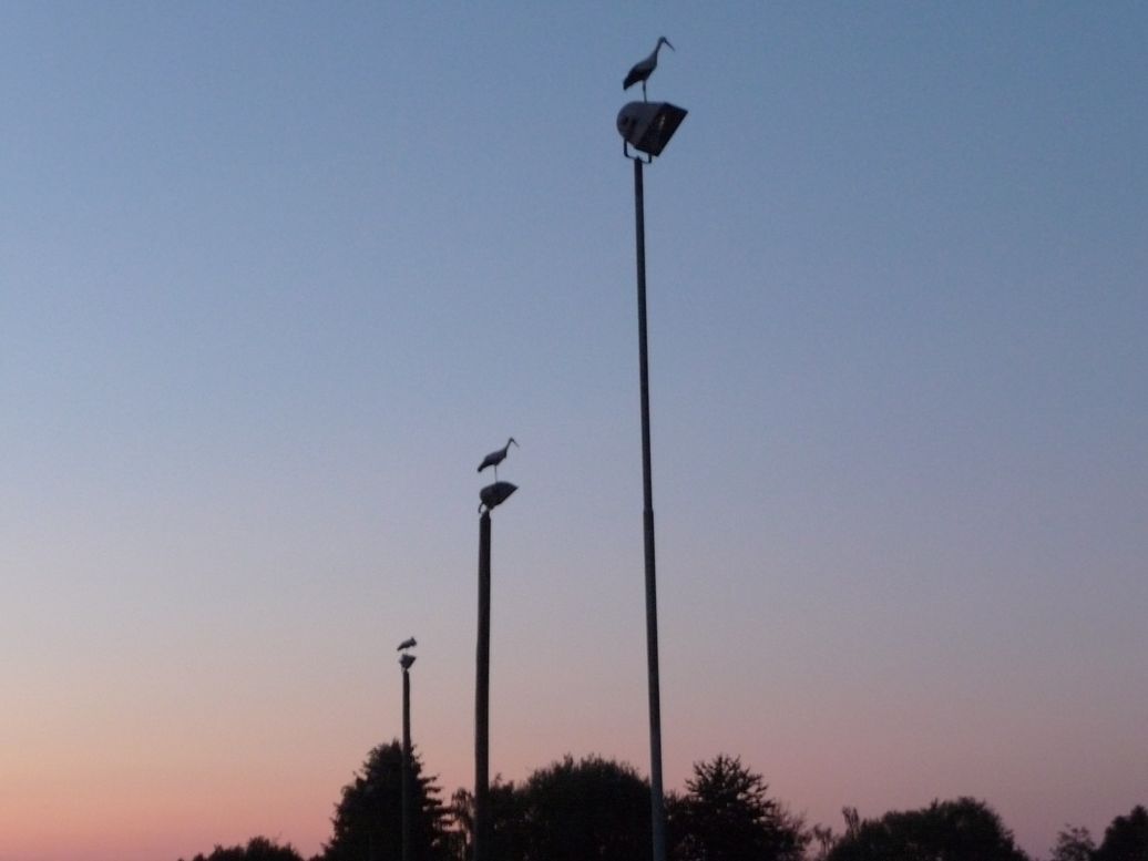 Drei Störche auf Flutlichtmasten